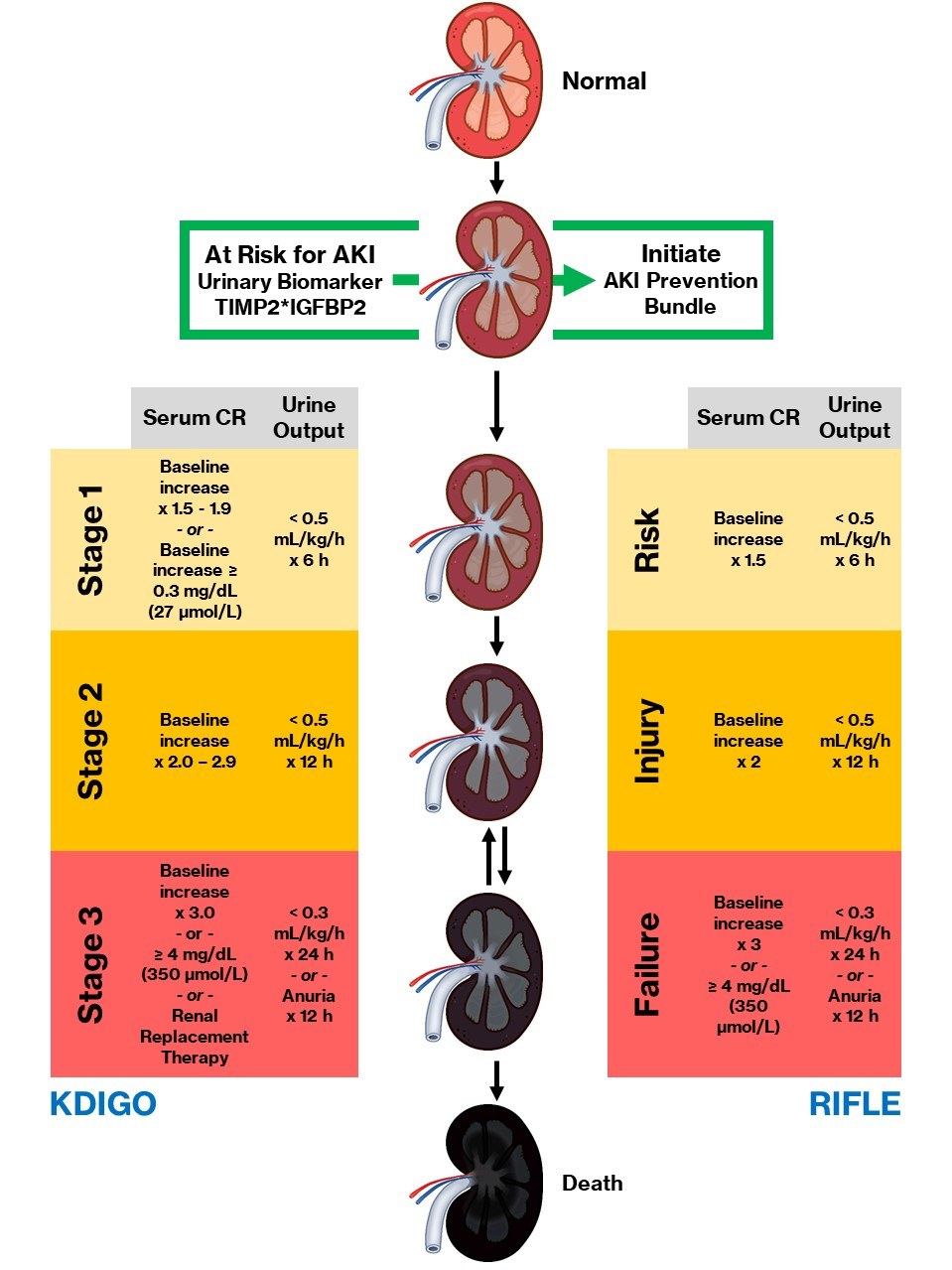 Even transient stage-1 (mild) AKI has a significant long-term impact on post cardiac surgery mortality. Urinary biomarkers, including tissue inhibitor of metalloproteinases-2 (TIMP-2) and insulin-like growth factor binding protein 7 (IGFBP7) have been shown to identify kidney's under stress (i.e. prior to injury), which are at risk for developing AKI. These markers are more sensitive then traditional measures of kidney function such as serum creatinine or urinary output.