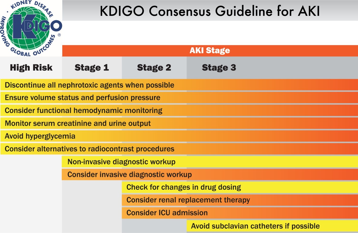 The KDIGO Guidelines is the primary international source guideline for classification, diagnosis, management, and prevention of AKI. Published in 2012, KDIGO offers graded AKI-risk interventions for kidneys under stress, prior to the occurrence of staged AKI.